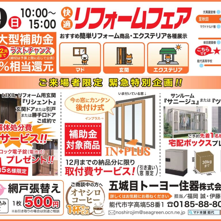 11月52025 寒い冬に向けて 快適リフォームフェアのご案内 五城目トーヨー住器㈱能代店 福岡, 開催中のイベント・キャンペーン 本チラシ・イベントについて 新聞掲載 2025年11月8日(土)(北羽新報社 様) イベント実施日 2025年11月9日(日)10:00~15:00 イベント告知サイト 五城目トーヨー住器株式会社 能代店 担当者 福岡・… 続きを読む