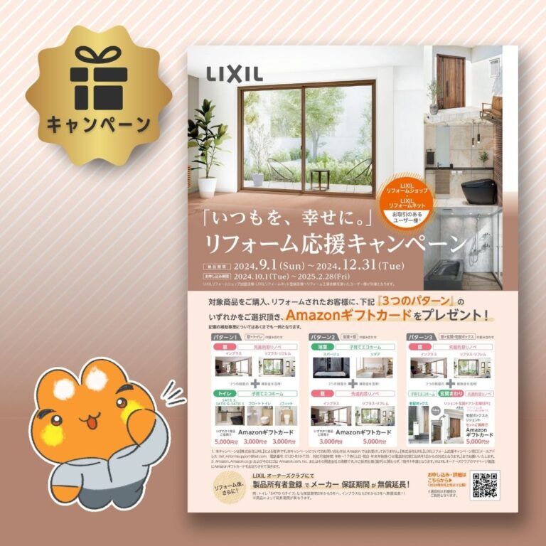 対象のマド・玄関・エクステリアのリフォームで豪華グッズが当たるチャンス!マド・玄関・エクステリア 家族がお家が気持ちeキャンペーン2024を実施中です。