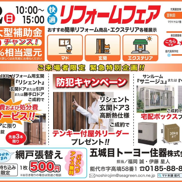 6月202025 【終了】快適リフォームフェア 五城目トーヨー住器㈱能代店 福岡, 終了したイベント・キャンペーン 今年最後の超大型補助金 このチャンスをうまく活用して快適な住まいをお客様に提供いたします。 続きを読む