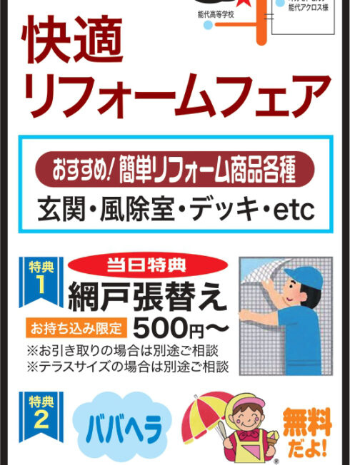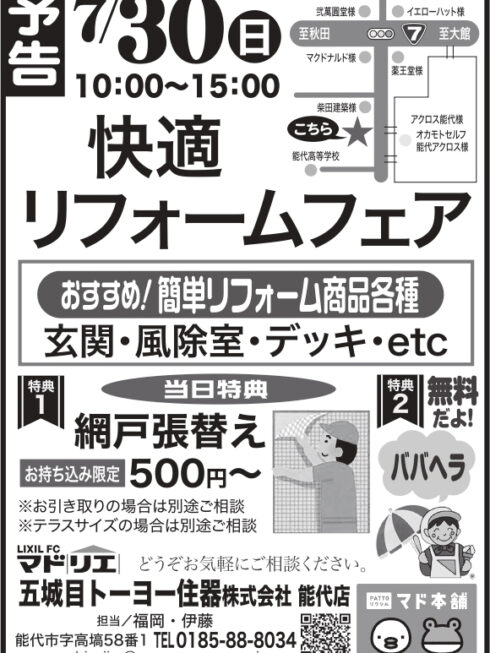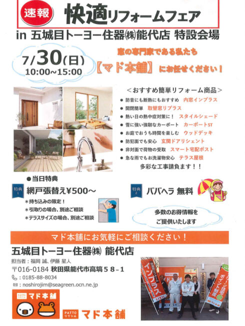 当日は五城目トーヨー住器㈱能代店にて、ウッドデッキをはじめ、多数のリフォーム商品のご紹介、解説、工事のご相談をお受けします!