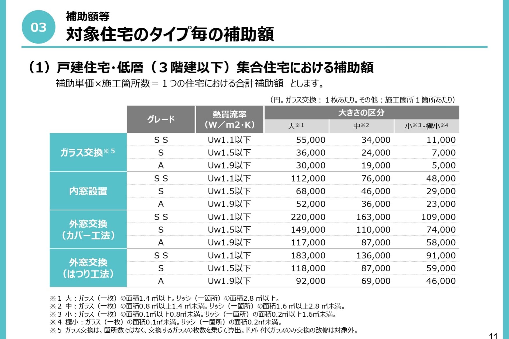 「外窓交換(カバー工法)」と「外窓交換(はつり工法)」の補助額が高く、次いで「内窓設置」、「ガラス交換」の順です。