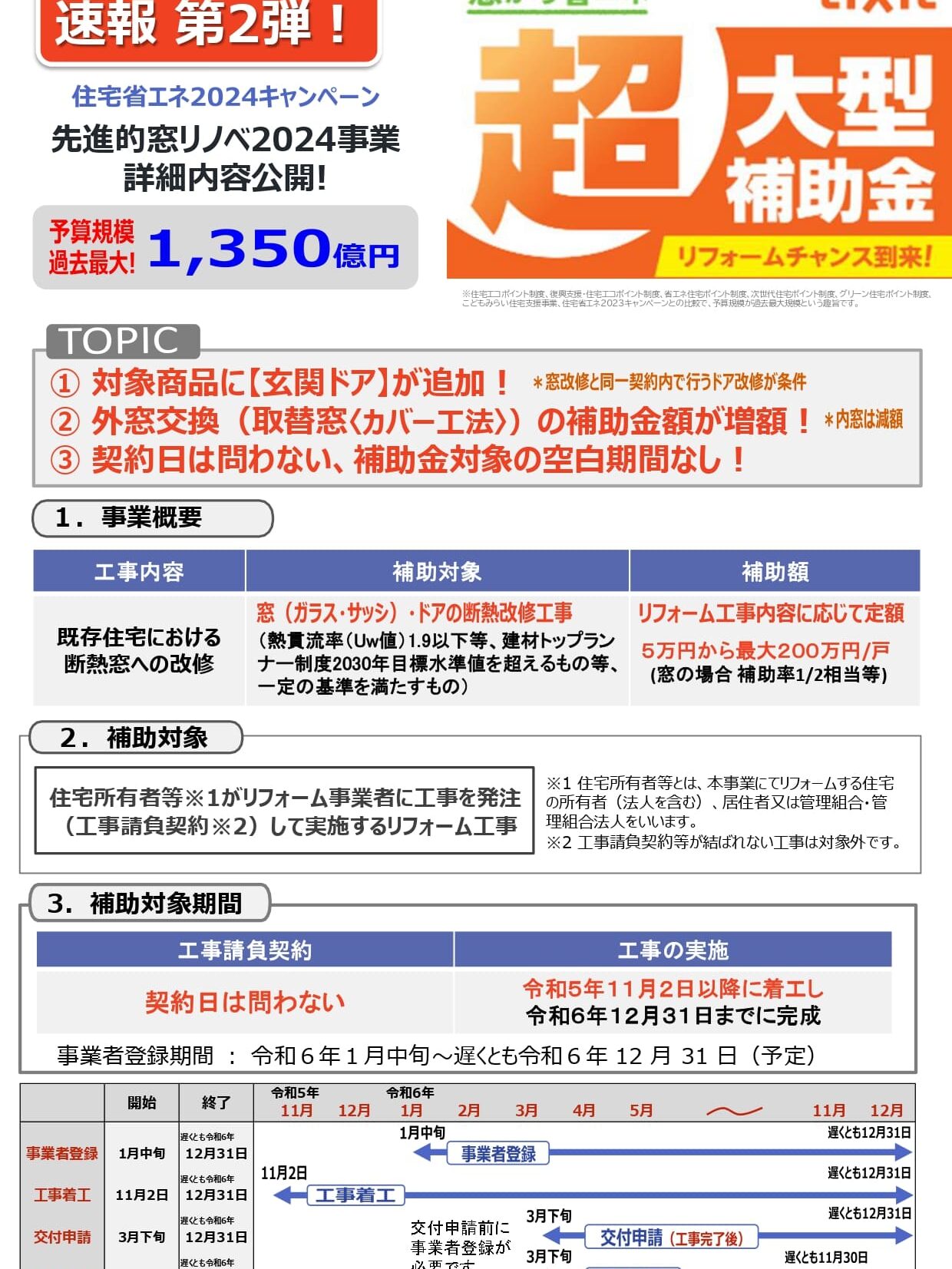 今回、本キャンペーンの1つ「断熱窓への改修促進等による住宅の省エネ・省CO2加速化支援事業(先進的窓リノベ2024事業)」の詳細内容が12月7日に公開されたのでお知らせします!