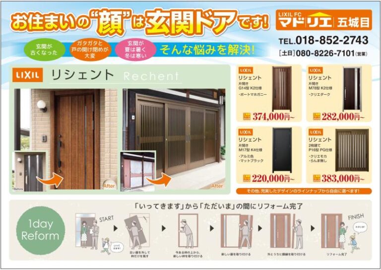 今回のチラシでは、玄関ドアリフォーム商品であるリシェントを中心に、水回りのリフォームとエクステリア工事をイベント限定価格で提供させていただいております。