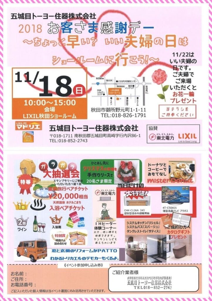ついに当社今年2回目のイベント要項が決まりました!! 今回のイベントのテーマは・・・ ’いい夫婦の日’をテーマにイベントを開催します♪ このイベントは終了しました。 このイベントは、ご好評のうち終了いたしました。ご来店、ご参加いただきましたお客さま 大変ありがとうございました。 五城目トーヨー住器株式会社のイベント情報は随時ホームページにて告知しております。 夫婦でご来場の際は、本チラシ↑をプリントアウト、 または同じ新聞折込チラシをご持参下さい。 お花一輪プレゼント! そして… 他にも様々なイベントを企画しているので、 ぜひご家族、ご夫婦でご参加ください!! 澤井 この記事を書いた人澤井 五城目トーヨー住器㈱本店 2024年2月7日 マドリエ五城目記事から再投稿しました。 この記事をシェア!カテゴリー: 五城目トーヨー住器㈱本店 澤井, 終了したイベント・キャンペーン2018年10月15日コメントするタグ: 当社のチラシ投稿ナビゲーション前へ前の投稿:当社イベント開催が決定!!次へ次の投稿:【終了】能代店 イベント情報|きみまちの里フェスティバル 物産フェアに出展します関連する記事はこちら超大型補助金が継続決定!住宅省エネキャンペーン2026年度も継続へ2025年12月12日「いつもを、幸せに。」リフォーム応援キャンペーン(2025/9/1~2025/12/31)2025年9月4日スパージュ10周年感謝キャンペーン(2025/7/2~2026/5/29)2025年7月2日パナソニック製食器洗い乾燥機キッチンセット割キャンペーン(2025/4/1~2026/3/31)2025年3月24日クレヴィ ワンアクションタッチレス水栓キャンペーン(2025/4/1~12/31)2025年3月24日イベント・キャンペーン一覧2025年3月7日
