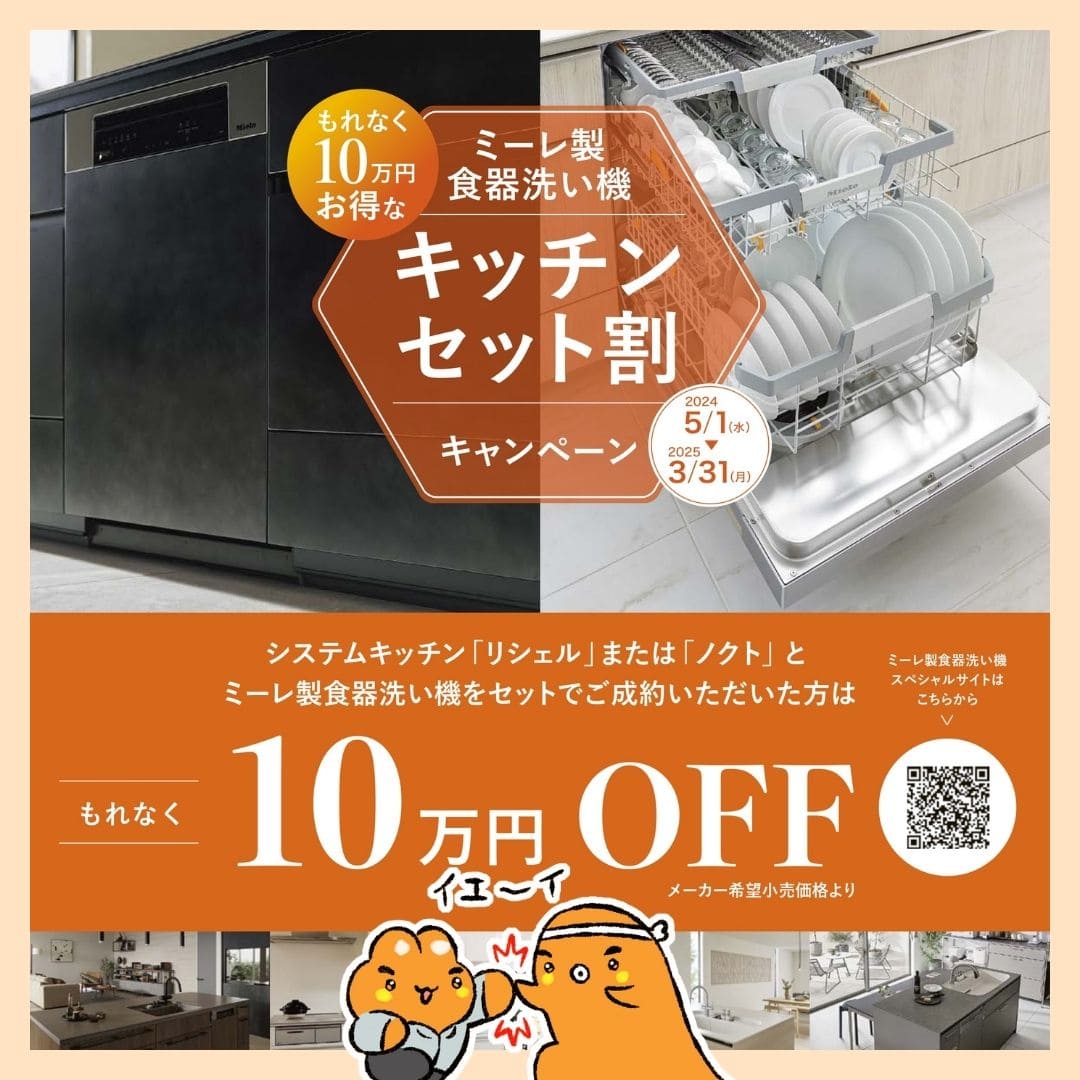 LIXILのシステムキッチン「リシェル」または「ノクト」と、ミーレ製食器洗い機をセットでご依頼、リフォームされたお客様はもれなく10万円OFF!という内容です!