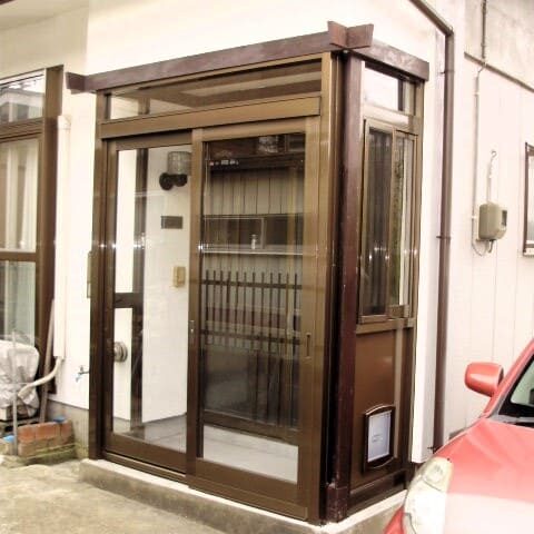 通路かわりの なが〜い風除室です。玄関庇があり 屋根工事新設に苦労しました…