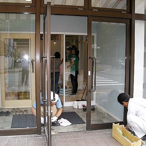 お店の入り口、ドア お元気ですか? フロアーヒンジ 取り換え工事やっている…