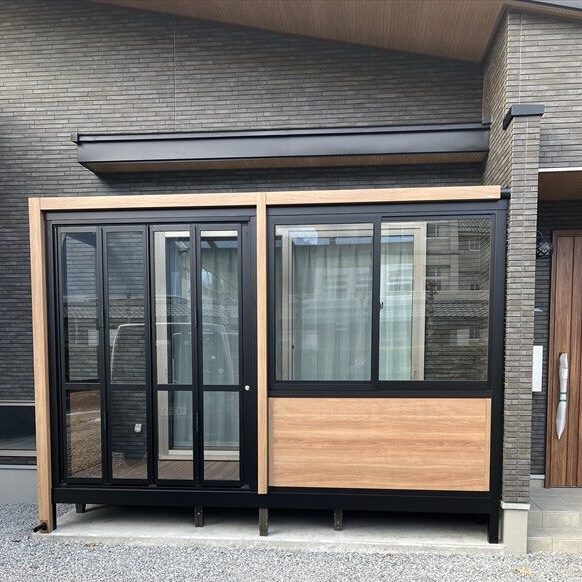 ガーデンルームの施工例になります。 半分を折戸、半分を腰壁にするなど、ライ…