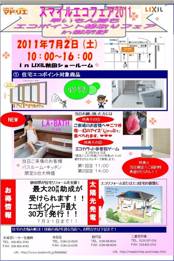 7月2日(土) LIXILショールームにて スマイルエコフェア2011 開催予定! このイベントは終了しました。 このイベントは、ご好評のうち終了いたしました。ご来店、ご参加いただきましたお客さま 大変ありがとうございました。 五城目トーヨー住器株式会社のイベント情報は随時ホームページにて告知しております。 住宅エコポイント対象商品 各種展示! 幻のアイス じゃっぷぅ 移動販売車特別参戦いたします。 その他 特典あり! ご来場お待ちしております。 2024年2月5日 マドリエ五城目記事から再投稿しました。 この記事をシェア!カテゴリー: 五城目トーヨー住器㈱本店のブログ, 終了したイベント・キャンペーン2011年6月14日コメントするタグ: 当社のチラシ投稿ナビゲーション前へ前の投稿:【終了】第2段 オープンハウス|児玉建設様の新築現場見学会次へ次の投稿:幻のアイス じゃっぷぅ関連する記事はこちら「いつもを、幸せに。」リフォーム応援キャンペーン(2025/9/1~2025/12/31)2025年9月4日スパージュ10周年感謝キャンペーン(2025/7/2~2026/5/29)2025年7月2日パナソニック製食器洗い乾燥機キッチンセット割キャンペーン(2025/4/1~2026/3/31)2025年3月24日クレヴィ ワンアクションタッチレス水栓キャンペーン(2025/4/1~12/31)2025年3月24日イベント・キャンペーン一覧2025年3月7日【ご購入・設置期間終了】秋田・岩手の冬も快適!冷たすぎる水に悩まないGreentap水栓キャンペーン【おいしさ満喫ギフト全員プレゼント】2025年3月6日