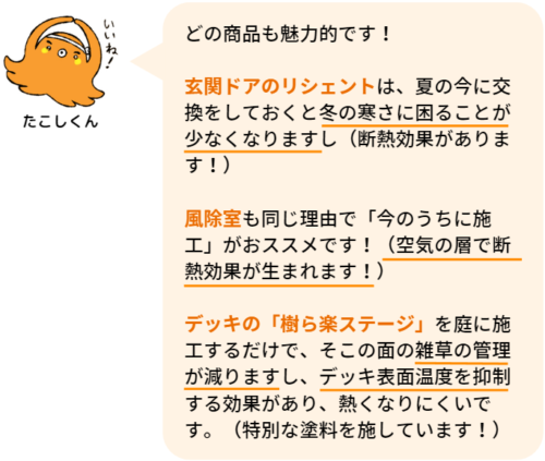 またそのほか、水回り商品の交換、エクステリア商品であるデッキ、テラスなどを紹介させて いただいております。