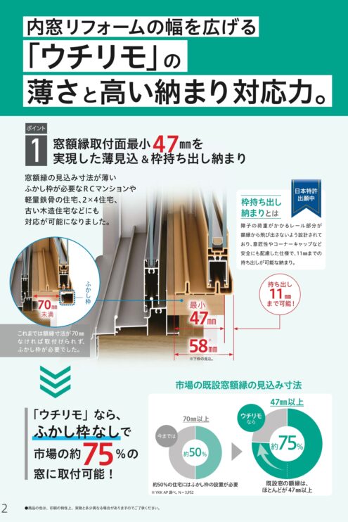 従来品は工事条件として、70㎜程度の幅が必要でした。この新商品であれば47㎜で工事可能なので、多くのご家庭やマンション、アパートに対応可能になります。この23㎜の違いを生む、サッシ業界的にはかなり画期的な商品です!
