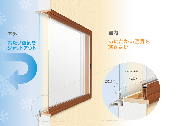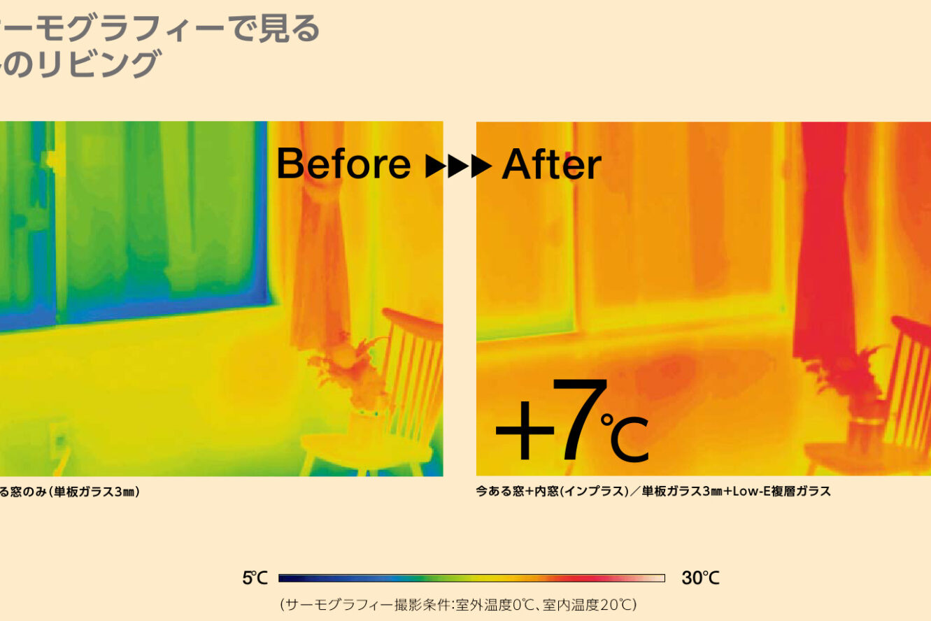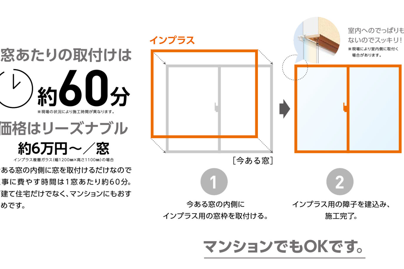 既存の窓と新しい窓の間にある空気の層が、外気の冷えと暑さの影響を軽減してくれます!施工時間も1窓につき約60分と、スピーディー。