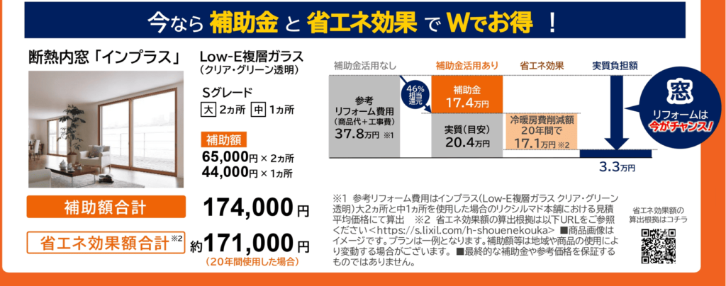 大きな窓2か所と中くらいの窓1か所をリフォームした場合、Sグレードで17万4千円の補助金が支給されます。