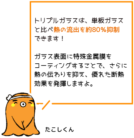 単板ガラスの熱の流出を約80%抑制できるトリプルガラス。