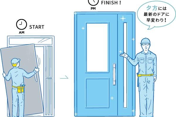 ドアリモは、今あるドア枠をそのままに、新しい枠を被せるので、一日で施工が完了するよ!