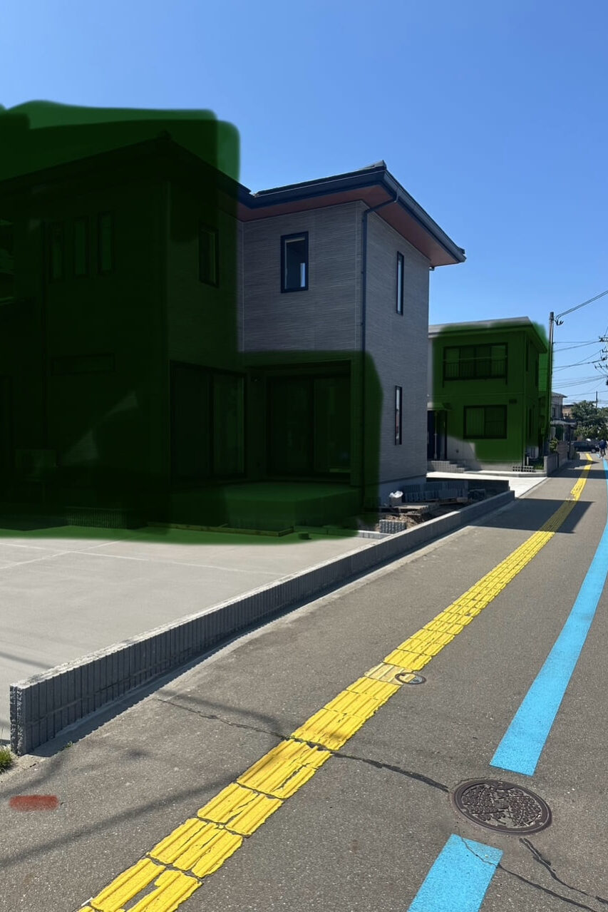 念願の新居!ウッドデッキ、芝生も敷いて家族でBBQが楽しみ、、、が目の前は交通量の多い県道、、、