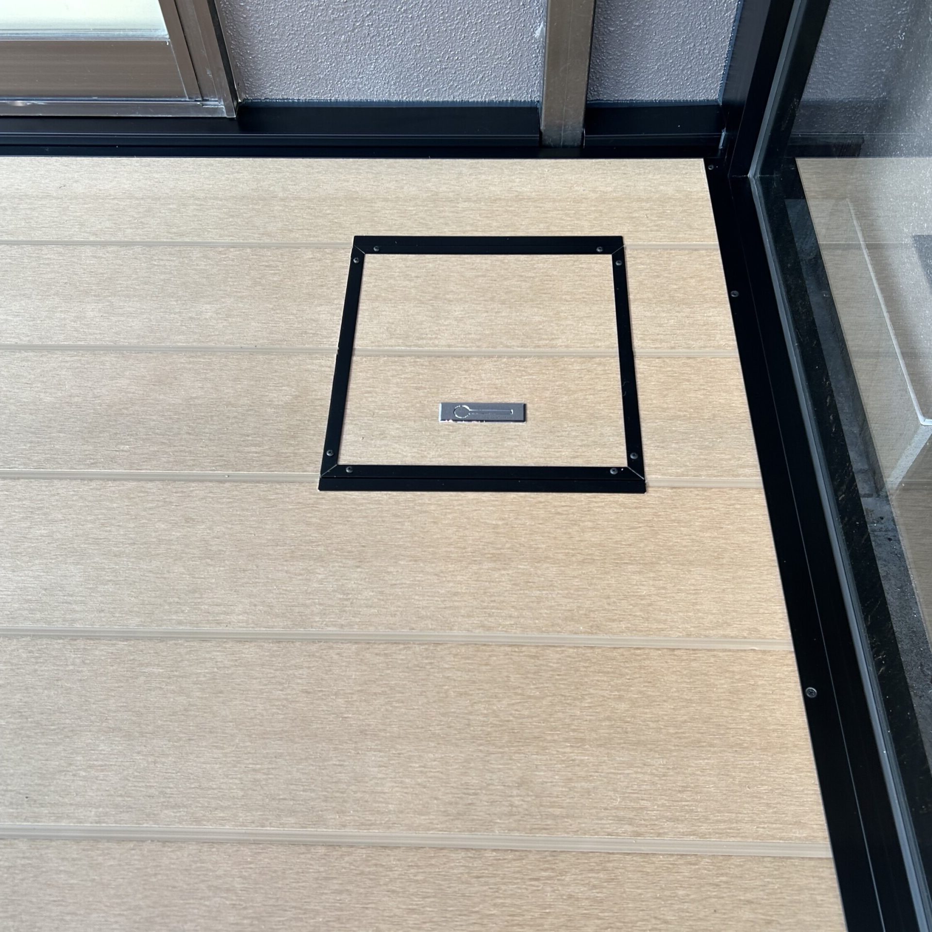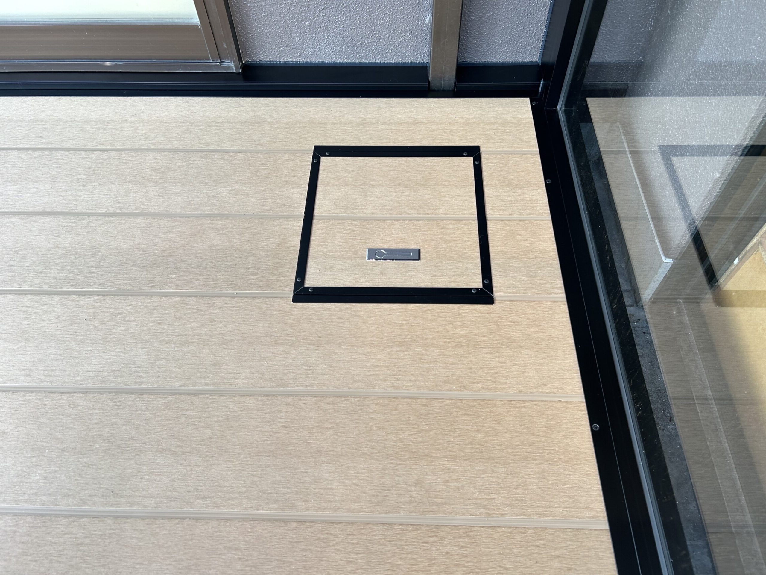 ② サニージュ本体の幅をできるだけ広く確保するため、屋外の水栓も一緒に囲う必要がありました。水栓は引き続き使えるよう、床材に穴を開けて蓋を設置。安全面にも配慮し、開け閉めできる仕様にしています。