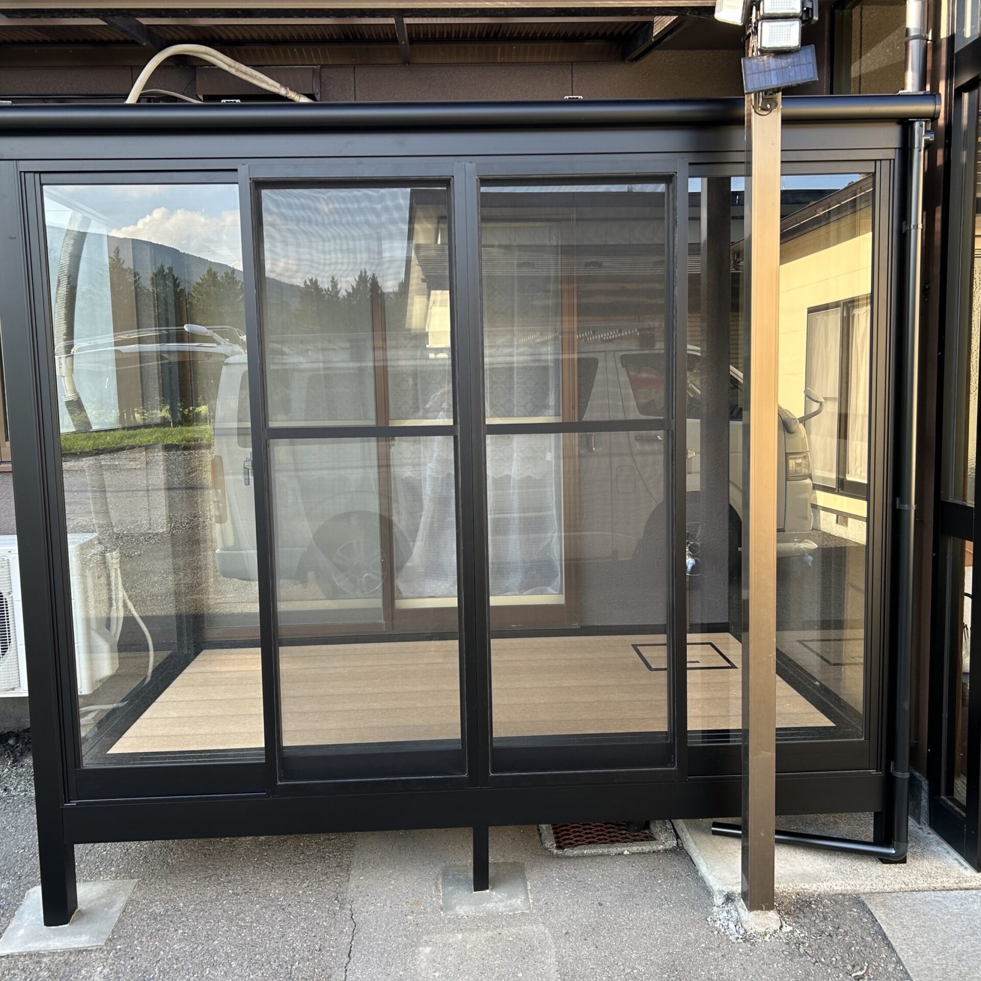 | 採用商品 | テラス囲い(LIXIL サニージュ 床納まり 人工木デッキ仕様) 本体カラー:ブラック サイズ:幅 2.5メートル / 高さ 2.2メートル / 奥行き 約1.5メートル(1485mm) 面積:4㎡ ガラス厚さ:5mm |