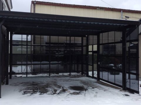 今回施工しましたお客様の要望が、雪対策をしたい、大きな車も止めたい、横風もふさぎたいので囲いたいが通路がある為に出入口も欲しい、、との要望