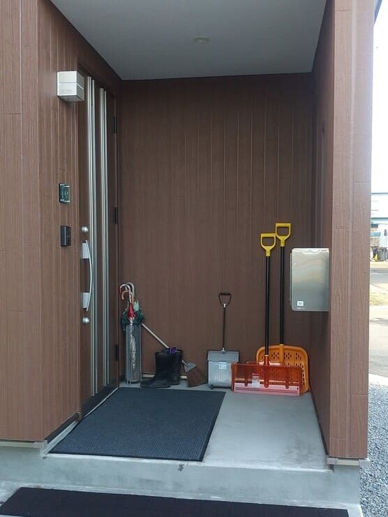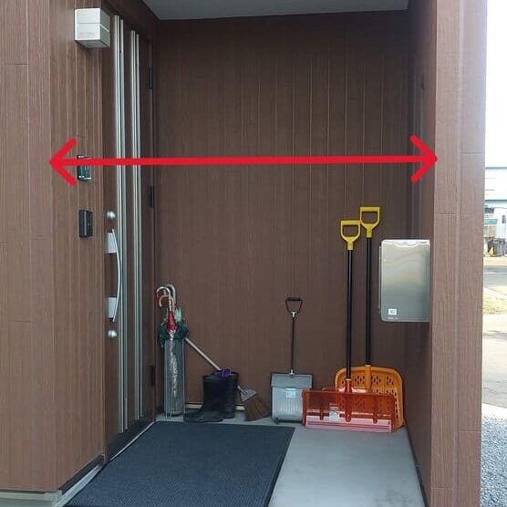 既存玄関前は開口幅が袖壁があるため少し狭く風除室を付けても