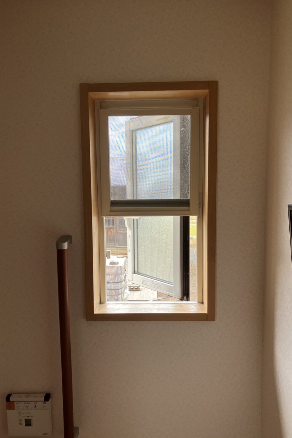 トイレには内開き窓を設置、換気のために網戸にして開けておくことが多いそうなのでオプションのアームストッパーを取付けて扉が90°以上開かないようにしました。